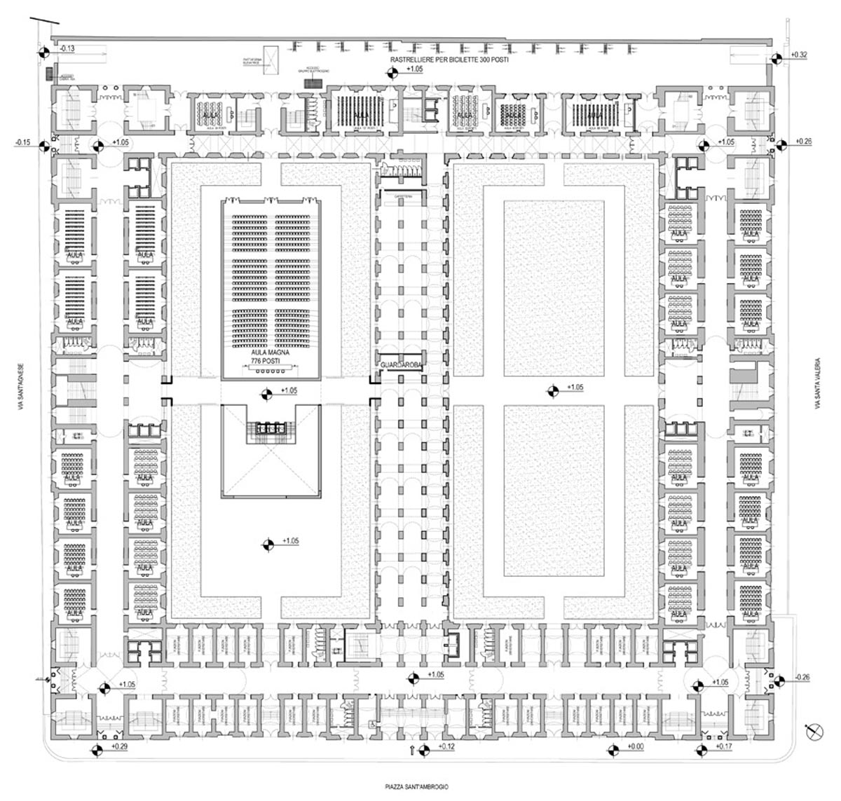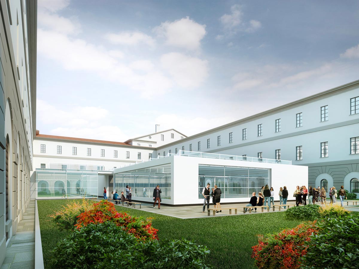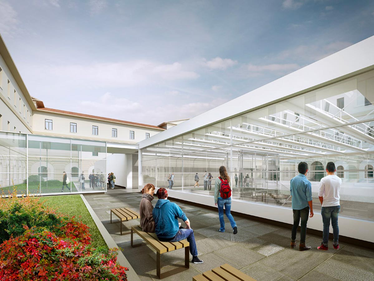 Il Campus si sviluppa su un’area di circa 54.175 metri quadri e il progetto architettonico, sviluppato da Beretta Associati, prevede la creazione di spazi che accorpano attività didattiche e servizi mediante l’ottimizzazione del layout interno dell’ex caserma in modo da consentire un armonico utilizzo in termini di ambienti dedicati alle nuove funzioni universitarie. Per recuperare spazi di grandi dimensioni il progetto ha previsto un intervento ipogeo in corrispondenza del cortile Nord con la realizzazione di un’Aula Magna di 776 posti e di un complesso di aule di grandi dimensioni per un totale di 2.500 posti. In superficie un nuovo volume con copertura a shed caratterizzato da grande semplicità ospiterà l’ingresso e i collegamenti verticali agli ampi spazi sottostanti.