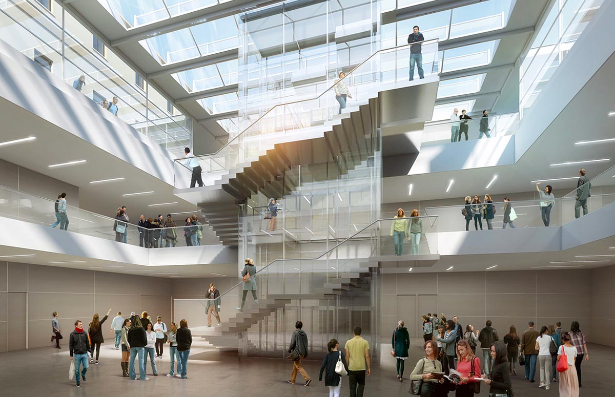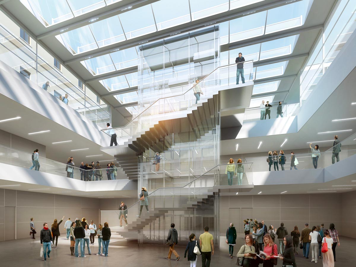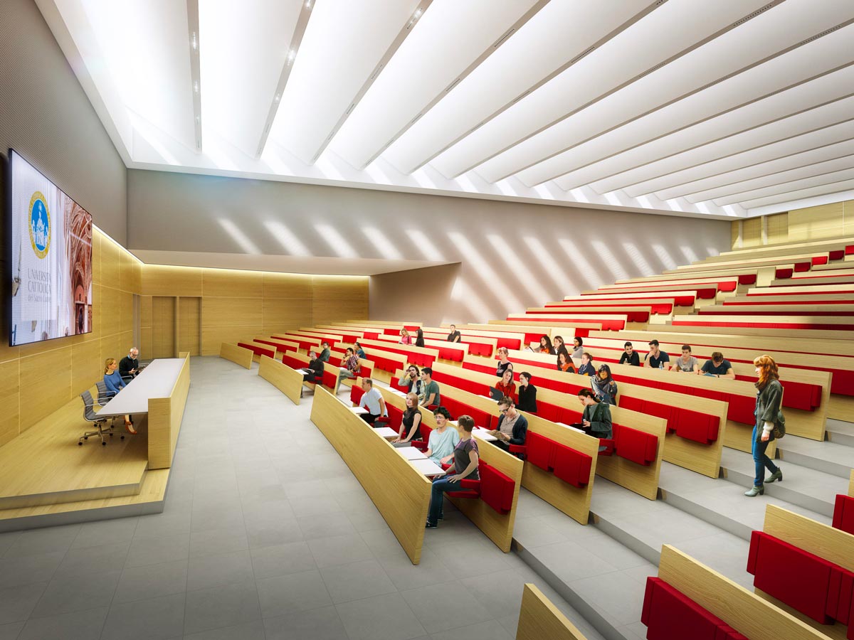 Il Campus si sviluppa su un’area di circa 54.175 metri quadri e il progetto architettonico, sviluppato da Beretta Associati, prevede la creazione di spazi che accorpano attività didattiche e servizi mediante l’ottimizzazione del layout interno dell’ex caserma in modo da consentire un armonico utilizzo in termini di ambienti dedicati alle nuove funzioni universitarie. Per recuperare spazi di grandi dimensioni il progetto ha previsto un intervento ipogeo in corrispondenza del cortile Nord con la realizzazione di un’Aula Magna di 776 posti e di un complesso di aule di grandi dimensioni per un totale di 2.500 posti. In superficie un nuovo volume con copertura a shed caratterizzato da grande semplicità ospiterà l’ingresso e i collegamenti verticali agli ampi spazi sottostanti.